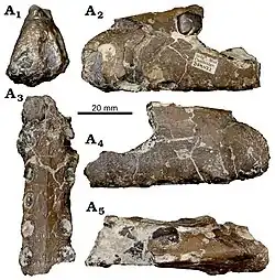 The British palaeontologist S. Christopher Bennett stated in 1993 that the holotype specimen of O. cuvieri was the right first wing-phalanx bone mentioned by Owen in 1851, and cited him for the name without further explanation.[26] In 1995, the Russian palaeontologist Natalia N. Bakhurina and the British palaeontologist David M. Unwin assigned a partial mandibular symphysis (the part connecting the two halves of the lower jaw) from Russia to cf. Anhanguera cuvieri (from Latin "confer", possibly belonging to this or a related animal), thereby using a new combination.[27] Unwin and colleagues assigned pterosaur skeletal elements from the Toolebuc Formation of Australia to Anhanguera ?cuvieri in 2000.[28] In 2001, Unwin also used the combination A. cuvieri, and cited Bowerbank for the name, with the snout as holotype. He assigned 23 jaw fragments from the Cambridge Greensand of England to A. cuvieri and considered it the most common pterosaur of that formation. Unwin concluded that the species O. brachyrhinus, O. colorhinus, O. dentatus, O. denticulatus, O. enchorhynchus, O. scaphorhynchus and O. xyphorhynchus were junior synonyms of A. cuvieri. He also considered a species originally named Pterodactylus fittoni by Owen in 1859 as a member of Anhanguera.[2] In 2011, the Brazilian palaeontologist Alexander W. Kellner and colleagues made the Australian material that had been assigned to A. ?cuvieri the basis of a new genus, Aussiedraco, and stated that they saw no ground for placing O. cuvieri in Anhanguera.[29]