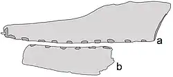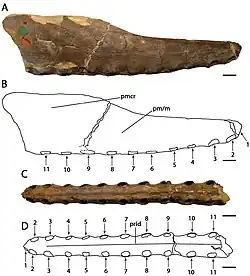 The holotype snout of C. dunni is composed of the front 18.5 cm (7.3 in) of the snout, comprising the premaxilla and maxilla (including a largely intact premaxillary crest), broken off just behind the 13th pair of tooth sockets. The cortical bone (the hard outer layer of bones) is well-preserved, though there are several regions where it is damaged or missing. The total number of tooth sockets preserved in the specimen is twenty-six. C. dunni is distinguished by the premaxillary crest beginning at the fourth socket pair, unlike that of C. cuvieri, and the crest is slightly upwards curved, forming a front edge that is concave.[7] The crest is fused entirely to the jaw, which indicates the individual was not a juvenile.[32] The upper edge of C. dunni's crest seems to descend moderately just before the broken portion, suggesting the crest was symmetrical from front to back when seen from the side. If the crest was symmetrical, the complete crest would have had a length of approximately 15 to 16 centimetres (5.9 to 6.3 in). The maximum height of the crest is 38 millimetres (1.5 in), which is above the ninth and tenth pair of tooth sockets. While crest-related features should be used with caution when identifying species, since they can be linked to growth stage or sexual dimorphism, the difference in crest-shape between C. dunni and C. cuvieri is probably unrelated to age, since the holotypes represent similarly sized individuals.[7]