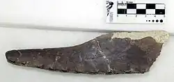 The snout which Bowerbank made the holotype specimen (on which the scientific name is based) of P. cuvieri consists of the front of the upper jaw, including part of a premaxillary crest (a crest on the premaxilla, the frontmost bone of the upper jaw), and is catalogued today as NHMUK PV 39409 at the Natural History Museum in London. It was originally reported to preserve a single tooth in the first right tooth socket (at the front of the snout), but this had disappeared when the holotype was examined in the 2000s. Two complete teeth were also originally reported to be preserved in the same block of chalk as the snout. Bowerbank also believed some large bones in three other collections may either have belonged to the same species, to P. giganteus, or to a third possible species.[5][10][11] The British biologist Richard Owen assigned one long bone to P. cuvieri in 1851 (today catalogued as NHMUK PV 41637) based on its size and the character of its surface, and identified it as a possible phalanx bone of the elongated wing-finger.[11][12]