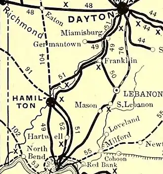 ![]() The CDT in 1904. Lines owned by the CDT are indicated with the number 49. Cincinnati is at bottom center, unlabeled. | |