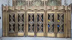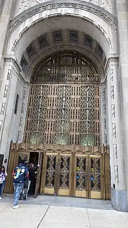 The building is ornamented with bronze and nickel silver grilles, over the windows, front entrance, and lobby interior.