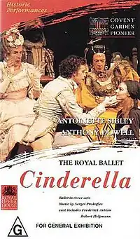 Antoinette Sibley as Cinderella and Anthony Dowell as The Prince, with Frederick Ashton and Robert Helpmann as the two Ugly Stepsisters (VHS cover).
