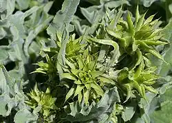 Compared to the other varieties, the flowering heads of C. f. var. campylon are strongly and permanently nodding; moreover, its outer phyllaries present a greenish color and have a length of 20 to 30 millimeters. The phyllaries are distinctly recurved and channeled, with the widest dimension below the middle; the upper phyllary element becoming a spine of three to five millimeters. Corolla tubes are five to six millimeters long with a throat of double the tube; lobes are four toe five millimeters and style branches are about the same size as lobes. Fruits are ovoid and smooth.