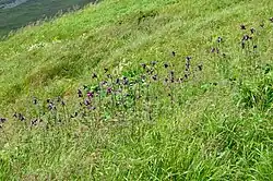 Grows on forest meadows, clearings, and edges.[19] But also above the treeline, among scrubs and on talus.[12]