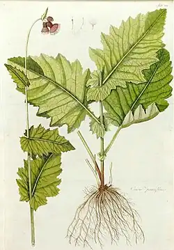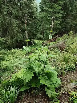 Basal leaves are [8.1-]9.0-26.1[-28.7] cm wide and [1.3-]1.4-2.2[-2.8] cm longer than wide in mature specimens.[1] Their morphology ranges from ovate, to orbicular,[6] to deltate especially in younger leaves. Peduncular leaves amplexicaul, often auriculate.[8] Their pinnate lobes are doubly serrate, with weak spinules up to 2 mm situated at the edges,[6] pubescent above and arachnoid-lanate below.[6]