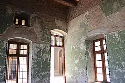 The perimeter wall of the citadel is not a continuous fortification wall, but consists of the façades of approximately 100 houses that have been built against each other. Because they have been built on or near the steep slope of the citadel mound, many of these façades were strengthened by buttresses to prevent their collapse or subsidence.[29] There were circa 30 city-palaces; most of them located along the perimeter of the citadel.[30] The oldest surviving house that can be securely dated through an inscription was built in 1893. The oldest houses can be found on the southeastern side of the mound, whereas houses on the northern perimeter date to the 1930s–1940s.[31][32] Before the introduction of modern building techniques, most houses on the citadel were built around a courtyard. A raised arcade overlooking the courtyard, a flat roof and a bent-access entrance to prevent views of the courtyard and the interior of the house were characteristic elements of the houses on the citadel.[30]