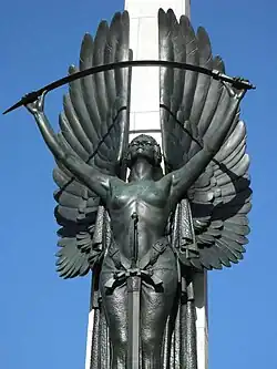 The bronze memorial stands 16 metres (52 ft) in height.[22] The compilation of bronzes were cast in London and are characterised as classicising idealism.[23] The allegorical figures included Youth, Sacrifice, Justice, Valour, and Peace.[7] They were based on Trethewey's family and friends, such as Trethewey's daughter Pauline,[9] his workman, Bob Hampton who modelled for Youth,[2] as well as the religious figure of Saint George.[8][22] An engraving at the base of the memorial states:[7]