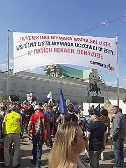 Citizens of Poland organize protests against monthly gatherings led by Jarosław Kaczyński, the leader of the Law and Justice party, ostensibly to commemorate the victims of the Smoleńsk airplane catastrophe, protesting against the claim it was a political assassination promoted during these meetings.[1][2] During one of their demonstrations a Solidarity-era hero Władysław Frasyniuk was accused of assaulting a policeman and later detained.[3][4] ORP were actively engaged in protests against unconstitutional justice reforms in July 2017.[5] They block extreme right-wing rallies and demand delegalization of organizations promoting rasism and xenophobia.[6] In January 2018 the movement addressed the opposition parties in Poland demanding open primary elections before regional elections of 2018.[7]
