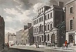 The construction of the building on South William Street, Dublin was driven by two of the most prominent members of the Society of Artists in Ireland, the sculptor Simon Vierpyl and woodcarver and gilder Richard Cranfield.[4] The society itself had only been established in 1764 with 12 members following an attempt by the Dublin Society to create its own annual exhibition and society.[5][6]