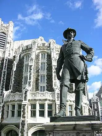 CCNY's Collegiate Gothic campus in Manhattanville was erected in 1906, replacing a downtown campus built in 1849.[64][65][66][67] This new campus was designed by George Browne Post. According to CCNY's published history, "The Landmark neo-Gothic buildings [...] are superb examples of English Perpendicular Gothic style and are among the first buildings, as an entire campus, to be built in the U.S. in this style. Groundbreaking for the Gothic Quadrangle buildings took place in 1903." There were five original neo-Gothic buildings on the upper Manhattan campus, which opened between 1906 and 1908: Shepard Hall, Baskerville Hall, Compton Hall, Harris Hall, and Wingate Hall.[68]