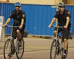 They are known to be equipped with batons, handcuffs, tear gas spray and, more recently, tasers.[2] They can also be equipped with firearms when performing municipal property security guard or valuable transporting duties. Because of their decentralized nature, the uniforms and vehicle liveries of the City Guards vary greatly. They also have hats or caps with a characteristic yellow-black checkerboard pattern.