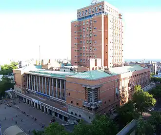 Construction began in 1935 and was inaugurated on July 16, 1941, although the actual building differs from the original 1929 Cravotto model;[4] his main tower measured 114m, which would have become the tallest building in the city, for financial reasons rose to only 78m, remaining in second place after the Palacio Salvo. It also lacked the brick siding. The side wings, the underground concourse, and the garage were built later, giving the building its current appearance. While not the tallest building in Montevideo, its location on 18 de Julio Avenue, built on the crest of a ridge or long hill, makes the building look more impressive. The area of the building had begun development in at least 1867.[5]