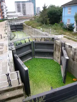City Mill Lock, which connects Bow Back River and the bottom of the City Mill River to the Waterworks River, was built as part of the 1930s improvement programme. Unlike Carpenter's Lock, which was built at the same time and was fitted with vertical radial gates, City Mill Lock was built with conventional mitre gates. Two pairs of gates pointing to the west, allowing the lock to be used when the level of the water in the Waterworks River was lower than that in the City Mill River, and a third pair pointing to the east, which prevented high tide levels in the Waterworks River forcing the gates open, and the City Mill River draining as the tide fell. The lock was 20 feet (6.1 m) wide, and could handle boats up to 87 feet (27 m) long. The original gates lasted for almost seventy years, but by 2000 were deemed to be unsafe, and were replaced by stop planks.[4]
