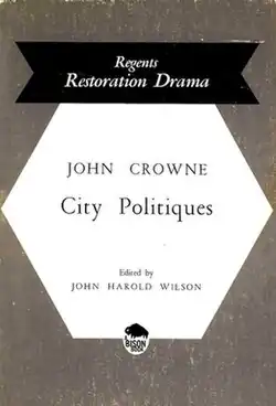 City Politiques is a 1683 comedy play by the English writer John Crowne. It was first performed by the United Company at the Theatre Royal, Drury Lane by the recently formed United Company. The original cast are not known.[1]
