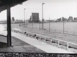 Distances were 400, 555 and 715 yards with an 'Inside McWhirter Trackless' hare system and ray timing and photo finish were also installed. The home straight contained the main grandstand and club with hare control and judges box opposite the winning post. The members club was a spacious modern club room with fully licensed bar and buffet. Subscription was £1, 1 shilling per annum. There were two entrances and car parks, one opposite the main stand on the other side of the track and one between bends three and four. The racing kennels could be found on the fourth bend but the 200 resident kennels were situated on the first bend with the exercising paddocks extending from the kennels to right around the second bend.[3]