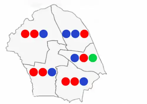 Map of elected councillors by party in each of the 5 wards[33]