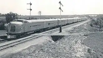 At the same time the Chicago, Burlington and Quincy Railroad, commonly known as the Burlington, had ordered two streamlined 10-car trainsets of its own: the Denver Zephyr, built by the Budd Company and modeled on the Pioneer Zephyr, the first articulated streamliner in the United States. While the City of Denver beat the Denver Zephyr into service, making its first run between Chicago and Denver on June 18, 1936, on May 31 the Burlington had deployed two of its existing trainsets, the original Zephyr and the Mark Twain Zephyr, on its own route between Chicago and Denver as the Advance Denver Zephyr.[5][6] While as fast as the City of Denver, the three-car sets in no way compared to amenities aboard the 12-car Union Pacific streamliners,[7] which included the "Frontier Shack" tavern, a dining-cocktail lounge, and a sleeper-lounge-observation car.[8] The Burlington's new equipment would arrive in November. The two services operated on nearly-identical schedules.[7] Fulfilling its early promise, the City of Denver traveled at an average speed of 66 miles per hour (106 km/h), the fastest of the Union Pacific's streamliners.[9][note 1]