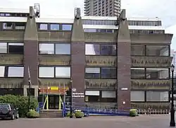 ![]() The School, seen on the right, facing the waterway and fountains of the Barbican Centre | |