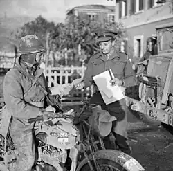 On 22 September, the Allies broke out and X Corps headed north towards Naples. The retreating Germans had blown every bridge across the River Sarno for 8 miles (13 km) inland, but 56th Division captured an intact bridge at San Mauro and continued past Naples to Capua, where the Germans were making a stand on the River Volturno. Assault crossings of rivers now became a feature of the campaign, and the signal units had to make special arrangements at assembly points, ensure waterproofing of equipment, and provide beachhead communications on the far side. Divisional HQs normally operated as Main and Rear echelons, sometimes with a small Tactical HQ. During phases of mobile warfare a Main HQ could move every day, and wireless and despatch riders had to be used until lines could be re-established.[27][28][29]