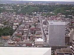- A densely populated urban area surrounds the central business district to the west and north, filling up the rest of the low, flat basin between the two highways and extending all the way to the foothills. Its major components are the West End and Over-the-Rhine.