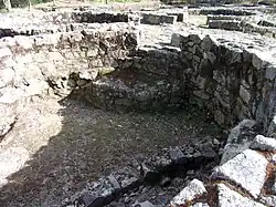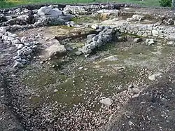 In 1980, Póvoa de Varzim City Hall invited Armando Coelho to pursue further archaeology works; these took place during the summer of that year.[3] Result were used for Coelho's project A Cultura Castreja do Norte de Portugal. Archaeological surveys led by the same archaeologist resumed in 1981, leading to the discovery of a grave and tombstones, which helped to comprehend the funerary rituals; housing, yards and walls were also surveyed,[12] which were the main focus for the 1982 archaeological surveys along with the recovery of Decumanus street (East-west).[13] Archaeology works resumed in 1989 and 1991.[14][15] The city hall purchased the acropolis area and constructed a small archaeological museum in its entrance.