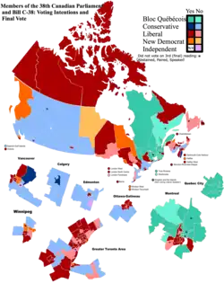 - June 28, 2005 – Bill C-38 passes its final reading a few minutes after 21:00 EST, 158–133, through the House of Commons. Liberal cabinet ministers were ordered by Prime Minister Paul Martin to vote for the legislation, while it remained a free vote for Liberal backbench MPs. Joe Comuzzi, a traditional opponent of same-sex marriage, resigned from Cabinet and voted against the bill. Almost all New Democrat and Bloc Québécois MPs voted in favour of the bill, while the Conservative MPs were virtually unanimous in voting against it (three voted in favour). Conservative Leader Stephen Harper made a controversial claim that "the law lacks legitimacy because it passed [only] with the support of the separatist Bloc party." NDP MP Bev Desjarlais voted against the bill and was stripped of her position in the NDP's shadow cabinet as Transport and the Canadian Wheat Board critic. She later lost her riding association's nomination for the riding of Churchill. The Bloc and the Conservatives declared C-38 a free vote.