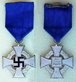 The Civil Service Faithful Service Medal (Treudienst-Ehrenzeichen für Beamte Angestellte und Arbeiter im öffentlichen Dienst) was a Nazi German medal of honour instituted on the 30th January 1938, in two grades (the first subdivided) and a special class Employee and Worker Faithful Service Medal to reward civilians for long and faithful service.[1]