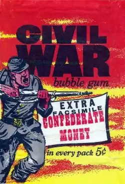 A similar series with the same artwork was later issued in Canada and A&BC produced a similar set in England, plus a French-language version for sale in France. A Spanish-language version was issued by Topps in 1968, with predominantly different artwork. The cards were issued five to a wax pack and were accompanied by facsimiles of paper currency of the Confederate States of America.[3] The original selling price was five cents per package. Topps later issued the cards in cellophane-wrapped strips ("cello packs").