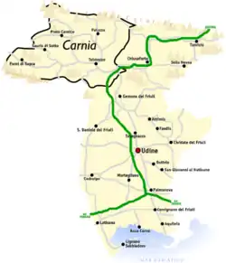 Carnia (Friulian: Cjargne or Cjargna/Cjargno in local variants, Venetian: Ciargna, German: Karnien, Slovene: Karnija) is a historical-geographic region in the northeastern Italian area of Friuli.[1][2] Its 27 municipalities all belong to the province of Udine, which itself is part of the autonomous Friuli-Venezia Giulia region.