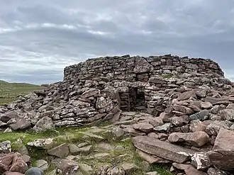 North of Clachtoll and adjacent to Stoer beach sits an Iron Age broch, a double walled tower standing by the sea shore with walls still standing up to 3 metres/10 feet high, although believed to have been originally much taller.[4] The broch features an impressive blue-green soapstone grinding stone. Archaeological excavation between 2017 and 2020 revealed that broch was probably built between 400 and 250 BC, and was burnt down between BC 50 and 25 AD .[5]