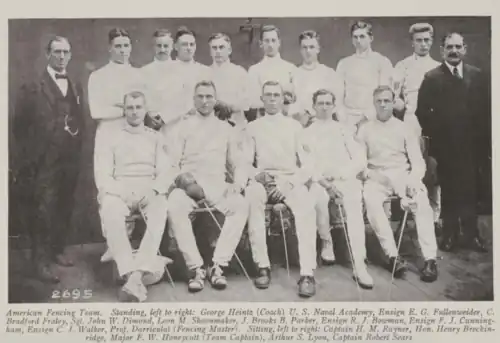 The US Olympic Fencing team sailed to Antwerp on the USS Frederick (ACR-8). They placed fencing mats and practiced on the quarterdeck for the duration of the journey,[7] under the eye of sabre coach George Heintz Jr., who was also the fencing master at the Naval Academy.[9]