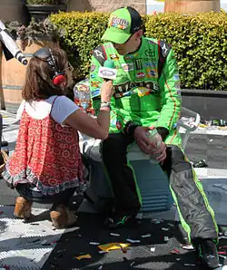 ![]() Lang interviewing Kyle Busch after he won the 2015 Toyota/Save Mart 350 | |