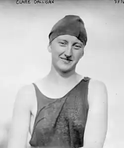 Claire Agnes Galligan (September 24, 1895, in New York – October 8, 1978, in Los Angeles, California[1]) was an American freestyle swimmer who won 13 AAU championships over distances ranging from 220 yd to 3 miles. In 1916 she became the first female AAU champion, and on September 13, 1917, she set a world record over 500 yd at 7:31.4. She missed the 1916 Olympics due to World War I, and by the 1920 Games was married to Edgar Finney[2] and retired from swimming. In 1970 she was inducted into the International Swimming Hall of Fame.[3]