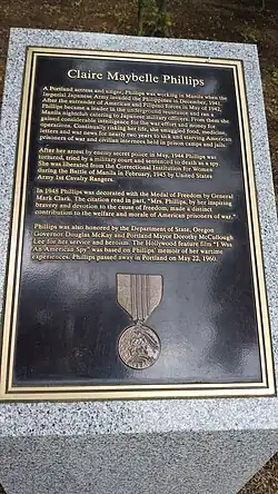 Upon the recommendation of General Douglas MacArthur, she received the Medal of Freedom in 1951.[10] She is honored at the Oregon World War II Memorial with a memorial plaque.