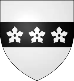 • Arms: Argent, on a fess Sable three cinquefoils of the First