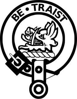 The crest badge suitable for clan members to wear contains the heraldic crest of a boar's head erased Proper, and the heraldic motto of BE TRAIST.[6]