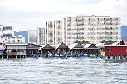 Also known as the 'New Jetty', the Mixed Clan Jetty was built in 1962.[1][7] Unlike the other jetties that are primarily occupied by separate clans, this jetty accommodates residents of various surnames. Construction of the new jetty followed stricter post-independence planning requirements from the state's Land Office.[1] Two of the houses were demolished to make way for water-carrying submarine pipelines in 1973.[1][9]