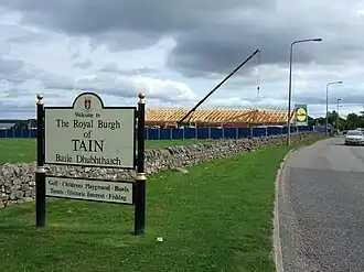 According to historian R.W Munro, if the Ross-shire MacCullochs had a Galloway origin then no details of it have been preserved, but it is possible that they came from some other part of Scotland. It is noteworthy, however, that an early record of a MacCulloch in Ross-shire was a 1431 inquest signed by Alexander MacCulloch who attached a seal bearing a shield, fretty, and apparent ermines similar to the coat of arms of the Galloway families.[32] The first record appears to be a 1398 Earl of Ross charter witnessed by Alexaner McCulach.[33] Plaids was formerly spelt Pladis, Pladdis, and the Pladdis. It is on the flat land on the coast to the east of Tain, about three quarters of a mile from the centre of the burgh. The estate gave its name to the territorial designation of the chiefly MacCulloch family of the North, who are recorded as land owners by documentary evidence from 1436 to 1552. In some early charters, Skardy is the designation used before Plaids came into use for the estate and although now obsolete as a place-name it has been equated with Hilton. What was known as Paul Mactire's Hill is near Plaids and was one of the 'court places' used by the Tain burgh.[34]