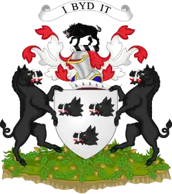 - Crest: A boar passant Sable, armed Argent and langued Gules