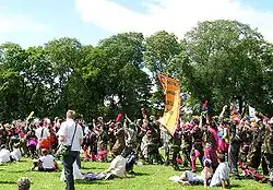 About 150 clowns acting for the Clandestine Insurgent Rebel Clown Army showed up to the protests against the G8 summit in July 2005.[10] Each day of the protests, a clown council made up of about 15 affinity groups, called 'gaggles', would be held to determine courses of action for the day.[11]