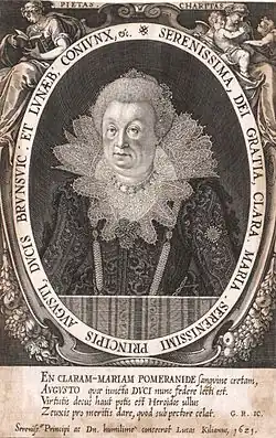 Clara Maria of Pomerania-Barth (10 July 1574 – 19 February 1623), was a member of the House of Griffins and by her two marriages Duchess of Mecklenburg-Schwerin-Ivenack and Brunswick-Dannenberg-Hitzacker.