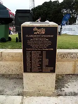 In August 2003 a plaque was placed at the Claremont Showground recognising the speedway which for 73 years operated on the site.