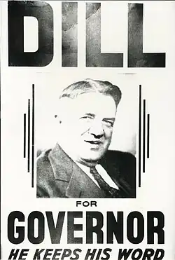Dill was elected to the U.S. Senate in 1922, beating two-term incumbent Republican Miles Poindexter. Dill campaigned as a supporter of Progressive reform and pledged to repeal the Esch–Cummins Act and push for the Columbia Basin Project.[10] Poindexter, who was supported by major newspapers such as The Spokesman-Review and The Seattle Times, attempted to portray Dill as a radical for his war record and his support of the Plumb Plan.[11] Dill carried Spokane County, much of Eastern Washington, and the urban counties of the Puget Sound region.[12] Dill was re-elected in 1928, but did not seek a third term in 1934. His election in 1928 marked the last time a candidate from Eastern Washington was elected U.S. Senator.[13]