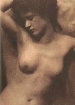 During this same year White and Stieglitz undertook an artistic experiment in which they jointly created a series of photographs of two models, Mabel Cramer and another known only as Miss Thompson.[28] Stieglitz offered suggestions about posing the models, White focused the camera, and one or the other of them would snap the shutter. White also developed the negatives and printed the photographs. One of the intentions of the experiment was to try a variety of printing techniques and papers, including platinum, gelatin silver and gum bichromate prints. On a few signed of the prints they signed with a monogram that combined both of their initials. During this collaboration, White learned the Autochrome color process from Stieglitz, who had just returned from Europe with this technical knowledge. White and Stieglitz jointly created at least one Autochrome during this time, which they exhibited later in the year.[29]