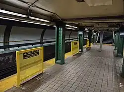 A further renovation during the mid-1980s involved refinishing the platform, installing new lights and new signs, repainting the station, and adding artwork.[52][60] The project was budgeted at $1.25 million and was to begin in January 1984, but it quickly experienced delays and budget overruns, in part due to issues with the contractor.[52] The MTA fired the original construction contractor, Standard Construction Services, in October 1985. At the time, the project was only 25 percent complete; tiles on the floors and walls had been removed, and part of the passageway connecting the platform to the elevators had been closed off, causing severe congestion during rush hours.[61] The MTA hired a new contractor. The passageway was partitioned off for over two years while new tiles were installed on the walls; work was complicated by the fact that some of the tiles had been stolen.[62] The renovation was also delayed because of poor communication: in one case, contractors installed a public-address system on a beam that was intended to contain new lighting.[63] The project was completed in May 1987,[62] and an artwork by Ray Ring was dedicated at the station in April 1988.[64]
