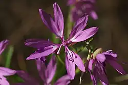 Clarkias are typically annual herbs, growing either prostrate or erect to a height of less than 2 metres. Their leaves are small and simple, from 1 to 10 cm in length depending on the species. Their flowers have four sepals and four petals, usually white, pink, or red, and are often spotted or streaked. Their fruit are elongated, cylindrical pods, usually 4-grooved or 8-grooved, and when mature they hold many tiny, cubical seeds.[2]