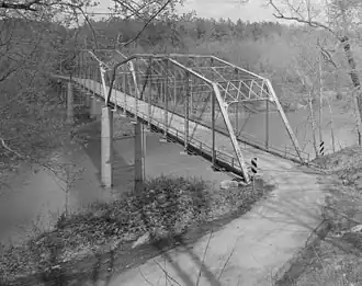 Clarkton Bridge was a historic Pratt truss bridge located over the Staunton River near Nathalie, in Charlotte County, Virginia. It was built in 1902 by the Virginia Bridge & Iron Co., and was the only remaining metal truss structure in Virginia built for highway purposes, which was supported by steel cylinder piers. It consisted of two camelback, pin-connected steel through truss channel spans, and twelve steel deck beam approach spans. The overall dimensions of the bridge approach and truss spans were as follows: north approach, 370 feet (110 m) with twelve deck spans; north truss, 150 feet (46 m); south truss, 150 feet (46 m). The total length of the bridge was 692 feet (211 m).[3]
