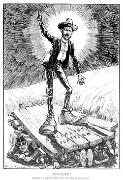 During October and November 1903 Marquet's regular page-one feature cartoon was absent from The Tocsin, though the issue of 26 November included a double-page cartoon as a supplement, 'Symeism Versus Democracy', notated with "Drawn on zinc and etched by C. A. Marquet".[38] By mid-December 1903 Marquet's regular cartoons had resumed, appearing regularly until early May 1904 (but only occasionally after that).[39][40]