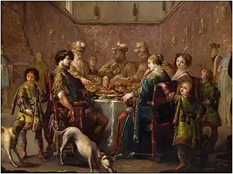 In the period 1630-1640 when the artist worked in Paris his palette became richer. He used rich tonalities, such as pink, blue, gold and bursts of red colour on soft gray background in his compositions. He relied on an original technique by executing his work in two successive stages: first he made a quick outline of the composition and then he painstakingly rendered the fabrics and jewelry, giving the material greater consistency and relief.[8] It was by relying on this technique that Vignon was able to establish a great reputation for the speed at which he painted. It also allowed him to produce the great number of paintings for which he is known.[4] The paintings of this period still hold reminiscences of Vignon's Caravaggesque period but are overlaid with a new decorative sensuality, which reflects a new sensibility emerging in Paris at that time.[3] An example of a work of this period is the Banquet Scene (At Sotheby's on 22 June 2010 in Paris, lot 19).[8]