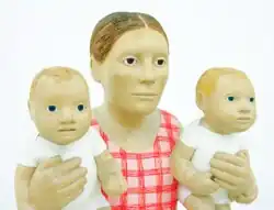 Her wooden figures rarely deviate from what Schreuders has established as her personal style. First, her work is often autobiographical. Her first six bodies of work represented different phases of her life: her graduate show reflected her life as a student; her second collection reflected her time in residencies in foreign countries; her third reflected on the reception of her work, and the following works concerned the birth of her first child and domestic life.[12] Schreuders states that “I enjoy art in which you can see the life where it comes from. Art that is solely about art is not as attractive to me as when there is life outside the work.” [13] The wood she often uses to carve her figures is jacaranda; a wood readily available in Pretoria, her hometown.[14] Second, the bodies are "stocky figures with slightly oversized heads and hands, carved in wood and rendered with enamel paint."[15] Third, her work has "small solitary figures with the aura of invisible or indeterminate narrative silences [and] generally expressionless faces that mask any overt or strong feelings."[5][16] Fourth, her depictions of everyday South African life comment on the residue of South Africa's colonial past and her own relationship with South African history. For instance, one sculpture is of "a black woman with a white child on her back" and "the child is built up out of cuts, as if the child is going to fall apart into slices the moment the woman unties the blanket."[17] Fifth her figures often have "vacant stares" and a "rigidity, even paralysis of movement" communicating that "all is not what it seems."[5]